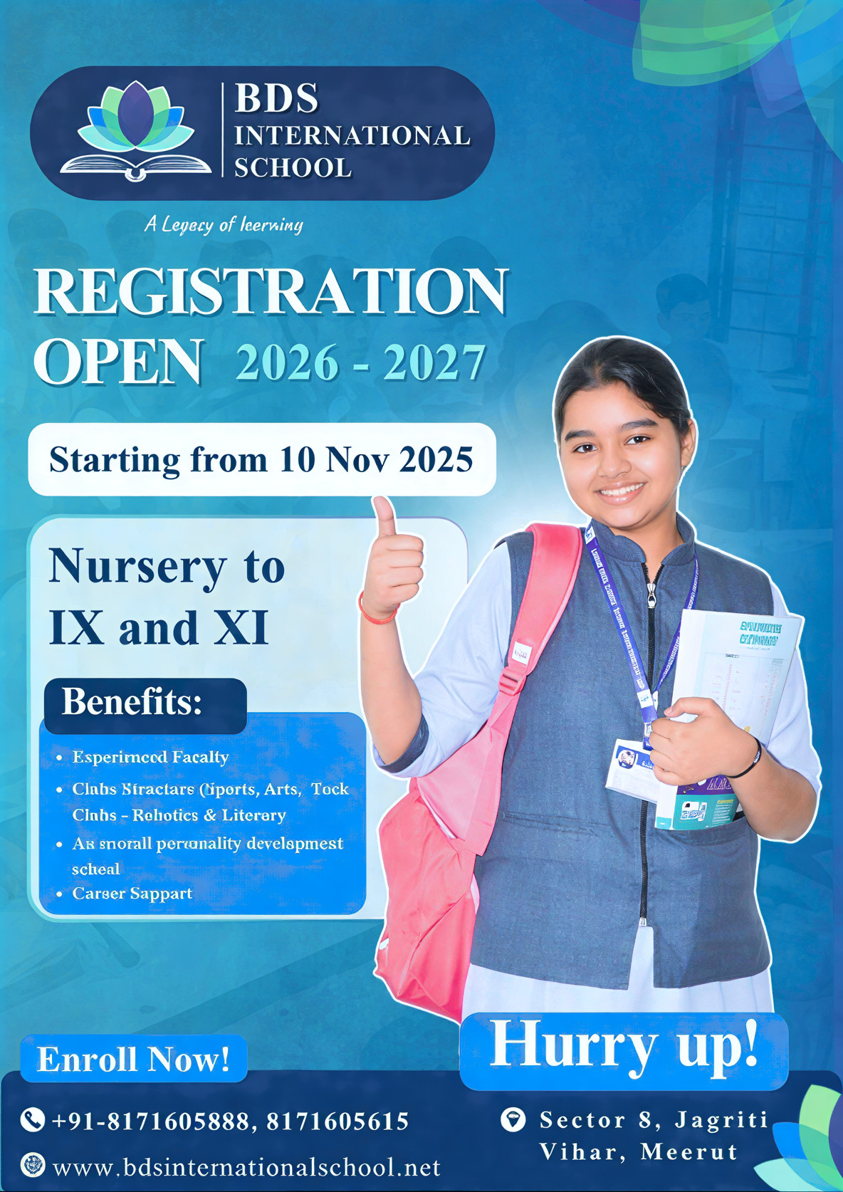 We, at BDS International School take pride in its excellent infrastructure, wide vision, student centered environment which has been suitably planned to accommodate 360 degree development of the students. The school provides full range of facilities for all the students to adjust them happily and make them feel distinguished and privileged.